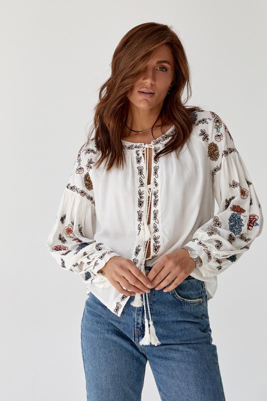 Жіноча блуза із зав'язками прикрашена вишивкою