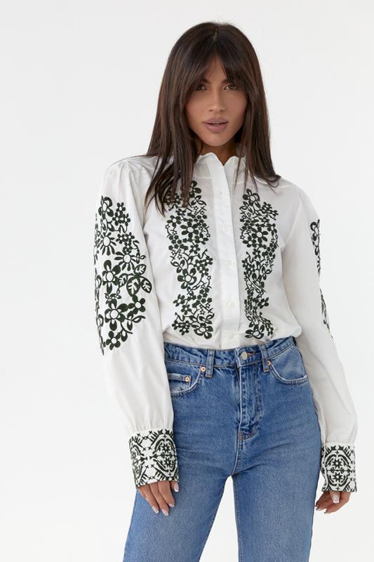 Рубашка с классическим воротником на стойке - просто must have в повседневном базовом гардеробе. А если это еще и модель с вышивкой, то с такой вещью вы сможете создавать множество образов для разных сезонов. Рубашка прямого кроя имеет прямой нижний край. Застегивается на пластиковые пуговицы. Основная часть рукавов, полочка и менжеты в модели украшены вышитыми узорами.