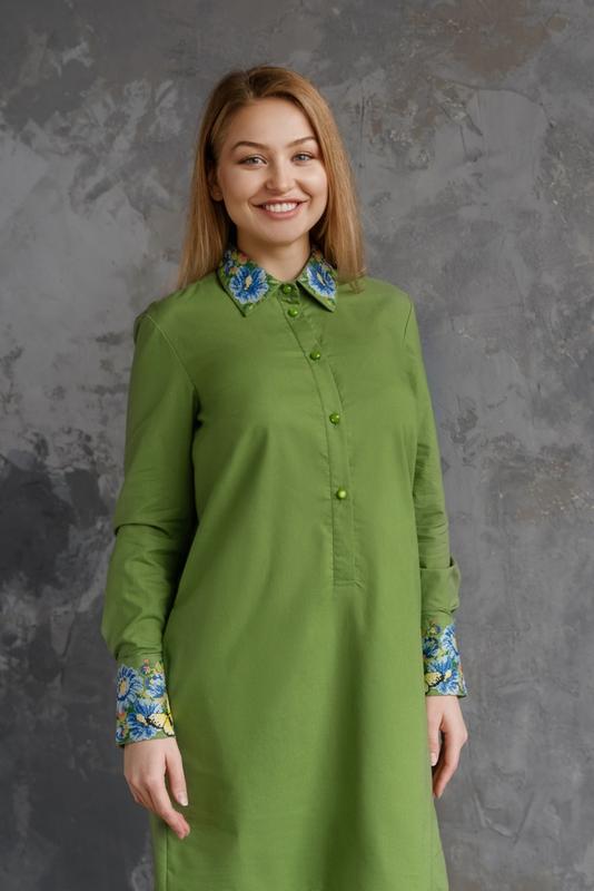 Зеленое вышитое платье с вышитыми манжетами и воротничком