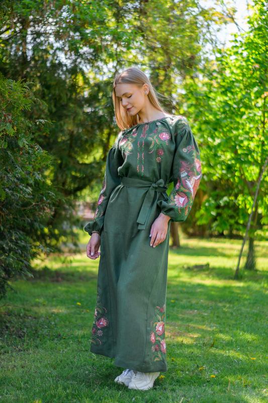 Пересилка цієї моделі здійснюється новою поштою тільки після 100% оплати на картку приватбанку або монобанку впродовж 1-5 робочих днів. Більше 2126 позитивних відгуків за 5 років відданої роботи говорять про те, що нам можна довіряти!!!!!!!!!! З накладною платою не працюємо. довга вишита сукня з льону " на крилах кохання " Оригінальний квітковий орнамент в стилі петриківського розпису покриває майже повністю верх вишиванки: рукава, манжети, плечі, груди. Спинка однотонна. Застібається вишиванка спереду. Пишні рукави починаються від плеча, а не від горловини, що дозволяє візуально зберегти тендітність жіночої статури. Поділ спідниці має вшиті з боків клини, які розширюють плаття трикутником донизу. На них також красується вишивка. У комплекті з сукнею йде і довгий пояс , що дозволяє підкреслити тонку жіночу талію. Тканина: 100% льон Буває міді або максі а також блуза з такою самою вишивкою Розмір від 42 до 56
