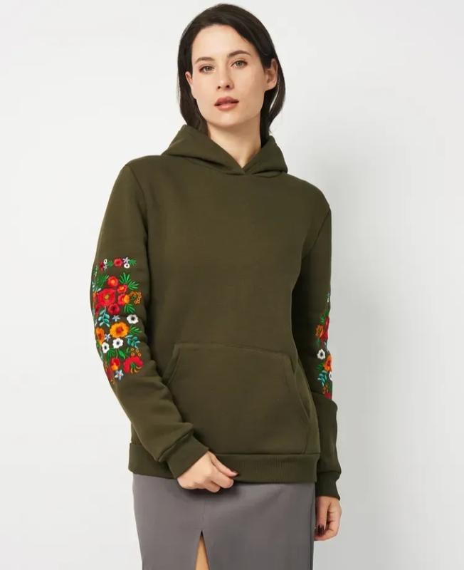 Женский худи с вышивкой Классический худи пошит из гребенного футерированного полотна трехнить чесана. Материал мягкий, гладкий, не скатывается, сохраняет тепло, хорошо держит форму и позволяет коже дышать. Мы используем исключительно гребенные полотна для лучшего качества. Классический крой, большой карман-кенгуру, манжеты из эластичного полотна. По рукавам – яркая машинная вышивка глади (вышитая нитками 100% полистер/100% вискоза), которая сохраняет вид даже после многократных стирок. Классический цвет хаки легко комбинируется с базовыми вещами. Худи сочетает удобство спортивной одежды с эстетикой украинской вышивки. просьба уточнять наличие размеров нольделяттричетырешим-симтринюльсимаймер