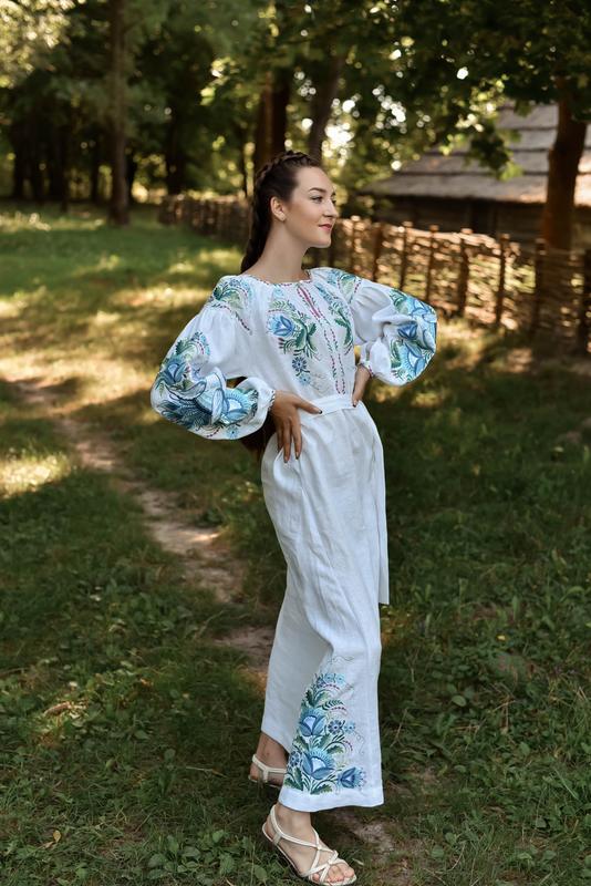 Пересилка цієї моделі здійснюється новою поштою тільки після 100% оплати на картку приватбанку або монобанку впродовж 1-5 робочих днів. Більше 2174 позитивних відгуків за 5 років відданої роботи говорять про те, що нам можна довіряти!!!!!!!!!! З накладною платою не працюємо. довга вишита сукня з льону " на крилах кохання " Оригінальний квітковий орнамент в стилі петриківського розпису покриває майже повністю верх вишиванки: рукава, манжети, плечі, груди. Спинка однотонна. Застібається вишиванка спереду. Пишні рукави починаються від плеча, а не від горловини, що дозволяє візуально зберегти тендітність жіночої статури. Поділ спідниці має вшиті з боків клини, які розширюють плаття трикутником донизу. На них також красується вишивка. У комплекті з сукнею йде і довгий пояс , що дозволяє підкреслити тонку жіночу талію. Тканина: 100% льон Буває міді або максі а також блуза ,чоловіча дитяча модель з такою самою вишивкою Розмір від 42 до 56