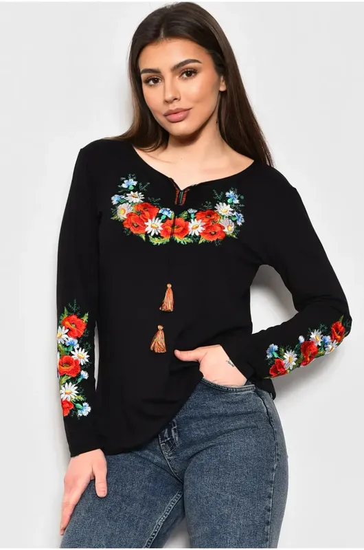 Блуза-вышиванка с вышитыми цветами и маками с длинным рукавом