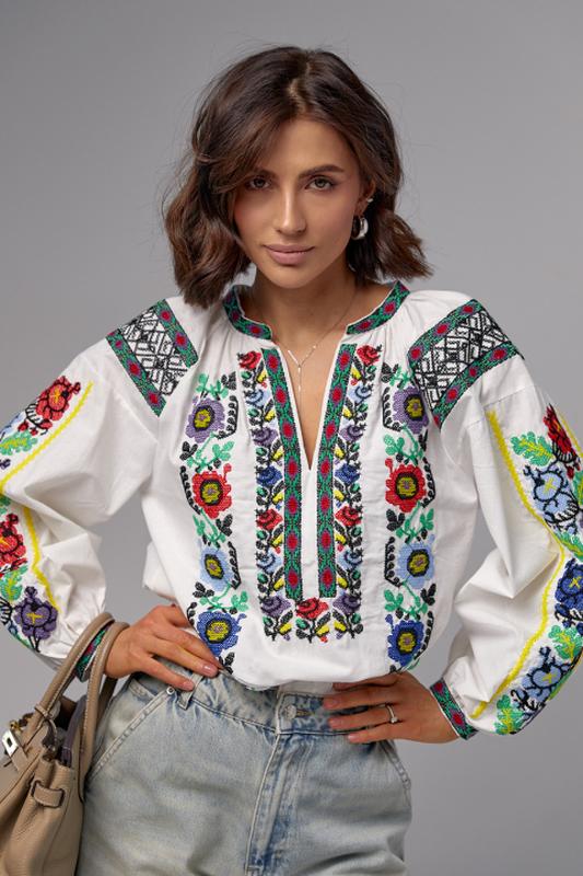У моделі довгі рукави-реглани складаються з двох частин, і повністю декоровані квітковою вишивкою хрестиком. Вузькі манжети на ґудзику внизу рукавів та окантування широкої горловини в сорочці прикрашені вишивкою. Спереду горловину доповнює невеликий виріз, який обрамлений вишитим прямокутником і з боків прикрашений великими квітами. Краї низу у виробі прямі. ЗАМІРИ ВИРОБУ Довжина переду виробу, см S - 62см; M - 62см; L - 62см Ширина під проймами рукавів (над грудьми), см S - 51см; M - 53см; L - 55см Довжина рукава від горловини, см S - 66см; M - 67см; L - 68см Країна - Туреччина Матеріал - Бавовна Склад тканини - 80% бавовна, 20% поліестер Розмір S, M, L Артикул 5614 Колір: молочний Наявність уточнюйте, будь ласка. Обмін/ повернення протягом 14 днів. Відправка 1-2 дні Відправка тільки Нова Пошта ( усі дні крім вихідних) Є багато інших моделей. Дивіться інші мої оголошення