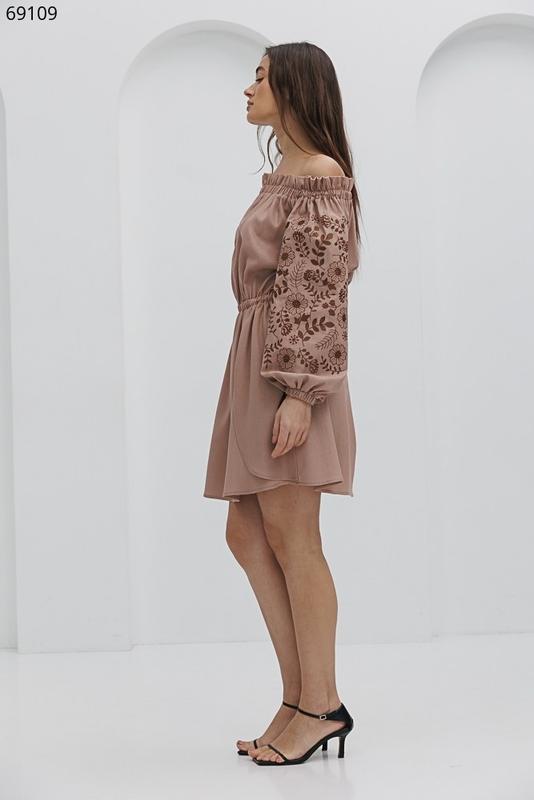Платье-вышиванка с открытыми плечами темно-бежевая с цветами гладью