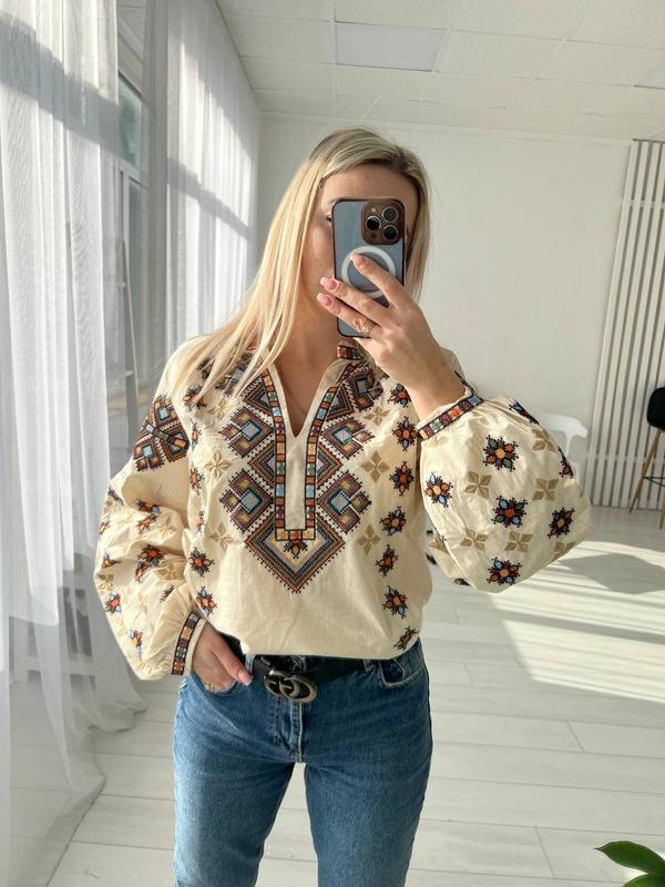 Вышиванка женская бежевая орнамент длинный рукав