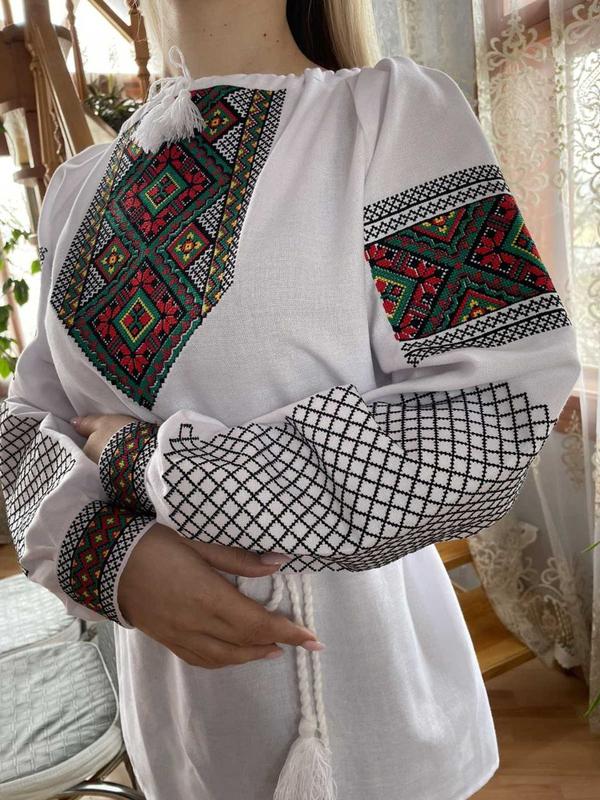 💯 Очень качественная женская вышиванка! 🌸 Тканина: домоткане полотно. 💥 Машинная вышивка. 🌈 Цвет: белая. 🔥Очень качественная ткань и пошив. 🔥 Производится по заказу: шьем по вашим индивидуальным замерам (от 46-го до 58-60). 😍 Это же так круто! Шеется и вышивается лично для вас!! <unk> Срок пошива: 7 рабочих дней. VV.