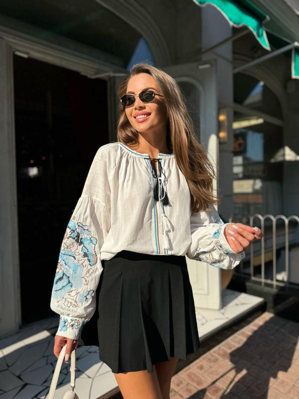 Женская стильная вышиванка, вышитая рубашка, белая с голубым орнаментом, блуза с вышивкой...