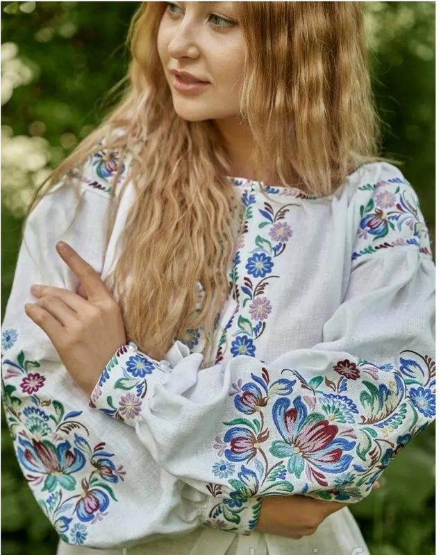 размер 42 44 46 размер 48 50 52 54 56 под заказ❗ тканина- льон Белое платье льняное с цветочной вышивкой Соединив нетронутую чистоту белого льна с нежностью сиреневых, синих, бордовых, коричневых и бирюзовых оттенков вышивки, наши дизайнеры создали непревзойденное льняное платье. В таком платье-вышиванке длиной до щиколоток хоть под венец! Цветочный орнамент в стиле петриковской росписи практически полностью покрывает пышные рукава, собранные широкими манжетами, горловину, плечи и вшитые по низу подола клини. Фасон платья свободный, что позволяет скрыть мелкие недостатки фигуры. А чтобы подчеркнуть ее красоту, следует использовать длинный белый пасок с синими кисточками, который идет в комплекте.