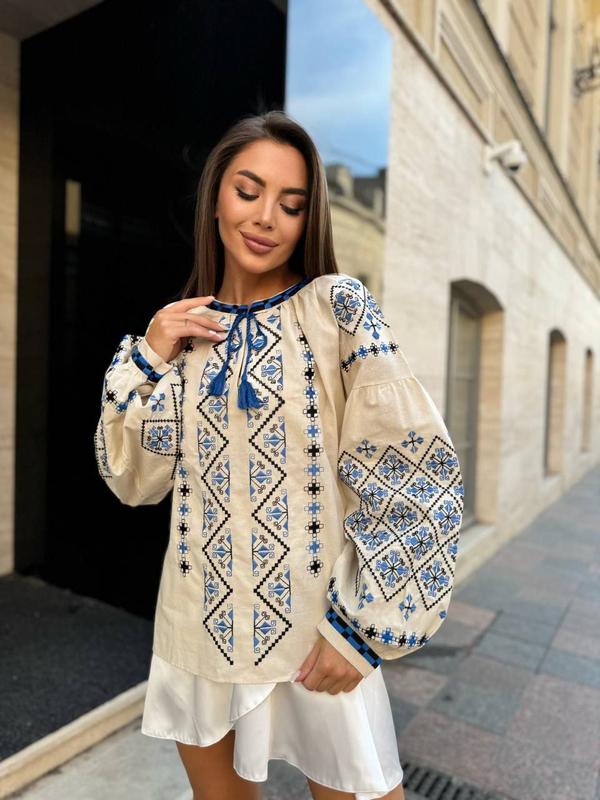 Рубашка с вышивкой в синих оттенках Цвет: белый и бежевый Размер S на объем груди до90-91, Размер M на ог до 96-99, Размер L на ог до 103-105 мод.апр78