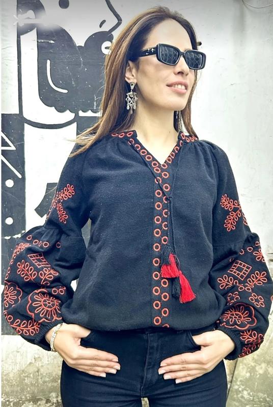 Обновите свой гардероб с этой стильной черной вышитой блузой с красными цветами! Выполнена из мягкого флиса, эта блуза обеспечит вам комфорт и тепло, а широкие рукава добавляют элегантности вашему образу. 📏 **Замеры:** - Длина: 64 см - Обхват грудей: 108 см - Длина рукава от горловины: 71 см 🚚 **Доставка:** - Накладной платеж доступен - Самовизез в Киеве - Доставка Новой Поштой Не упустите возможность выглядеть безупречно! #muhteshem100