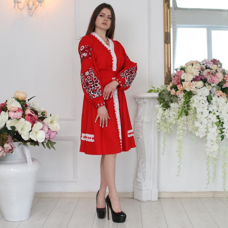 В такому вбранні важко залишитись непоміченою. Не соромтесь, ловіть захопливі погляди на собі і будьте у центрі уваги оточуючих. Підкресліть свою красу, харизму та відчуття доброго смаку, обравши наш вишитий одяг. Жіноче вишите плаття "Фернанда" При замовленні враховуються будь-які побажання Клієнта (фасон, колір, матеріал, візерунок тощо), а також можливий варіант пошиття сукні на дітей різного віку. Жіноче вишите плаття "Фернанда" - Техніка вишивання: машинна; - Тканина: на фото - льон, (Тканини на вибір - велюр, льон, домоткане полотно, габардин, батист, атлас, онікс, шифон, мадонна); - Колір: червоний; - Фасон сукні: пряме з клинами та поясом; - Довжина сукні: по коліно (100 см); - Рукав: довгий "бохо"; - Розмір: 40-66 або Ваші особисті мірки (зріст, обхват грудей, обхват талії, обхват стегон). Бажаєте створити яскравий святковий образ? Що може бути краще за вишиту сукню. Вона є синонімом жіночності і краси. Легка і яскрава, наче весна, що буяє в серці кожної українки. В такому вбранні важко залишитись непоміченою. Не соромтесь, ловіть захопливі погляди на собі і будьте у центрі уваги оточуючих. Адже кожна жінка варта того! Бажаєте комплект вишиванок у одному стилі для всієї сім'ї?! Не проблема!.. Ми пошиємо плаття, блузки, сорочки з однаковим візерунком як на дорослих, так і для дітей. Ми займається пошиттям вишитого одягу вже більше 8-ми років. У нас одні з найкращих цін на ринку України. Про якість наших товарів свідчать відгуки наших задоволених клієнтів! В нашому асортименті є вишиті жіночі сукні, блузки, чоловічі вишиті сорочки та дитячі вишиванки. Наша особливість це те, що ми - виробники і можемо будь-яку модель пошити індивідуально під ваші розміри. Не менш важливою особливістю, є можливість пошиття цілого комплекту з ідентичним візерунком, наприклад, для чоловіка, дружини та доньки з сином! Замовивши у нас - Ви залишитеся задоволеними, адже ми - гарантуємо якість нашого товару. Купувати товар у нас можна і гуртом і в роздріб. Також ми працюємо по перерахунку з організаціями. Пошиття будь-якої моделі можливо, як за індивідуальними мірками, так і за стандартними розмірами. Для пошиття використовується тільки найякісніша тканина! Для гуртових клієнтів - виготовляємо безкоштовний зразок і відправляємо за наш рахунок. Після чого замовник може внести коригування і відправити зразок назад. Ми можемо виготовити будь-яку модель індивідуально з візерунком, який Ви забажаєте! Ще однією з переваг - одні з найнижчих цін на ринку. У нашому асортименті є, як і більш дорогі варіанти, так і бюджетні - для будь-якого гаманця! Якщо у Вас виникають запитання - телефонуйте до нашого консультанта. Ми з радістю відповімо на усі Ваші запитання і допоможемо підібрати розмір чі модель товару! Замовити товар Ви можете залишивши його через кошик вказавши свої дані та розмір товару (або Ваші заміри). Також, це можна зробити по телефону з менеджером! Після уточнення усіх деталей - замовлення передається на виготовлення. Коли вишиванка готова - ви можете обрати спосіб оплати та доставки. На гуртові замовлення більше 5 шт. одного виробу (візерунку) потрібно вносити 30% передплату перед виготовленням товару.