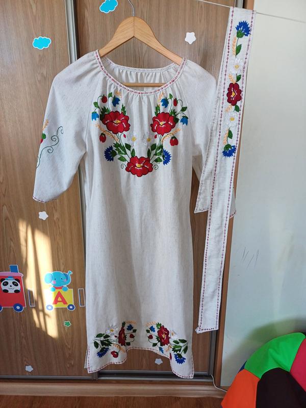 Вышитое платье с пряссой в идеальном состоянии. Длина 98 см Груди 48 см Талия 45 см Бедра 49 см Рукав от воротника 44 см Поям 145 см