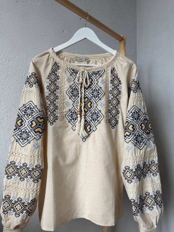 Женская вышиванка в этно стиле бежевая традиционный орнамент длинный рукав