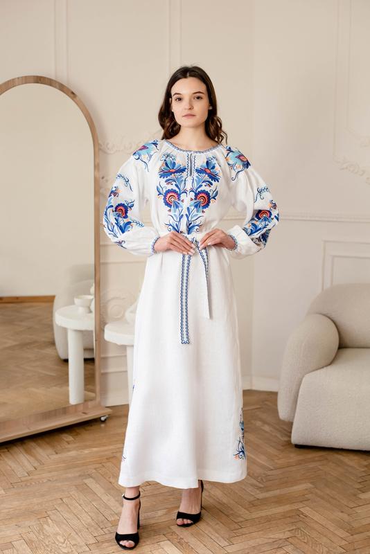 Платье длиной макси с поясом под заказ машинная или ручная стирка с обратной стороны до 40°С глажка с обратной стороны до 110°С Тканина : 100 % льон Это долгое платье макси выполнено из натурального 100% льна, что обеспечивает комфорт и легкость в носке. Она имеет свободный, слегка расклешенный силуэт, подчеркивающий естественную грацию и женственность. Вышивка — изящная и искусно выполненная, с богатым растительным орнаментом. Крупные фантазийные цветы гармонично переплетаются с листьями и веточками, создавая эффектный рисунок. Вышитые элементы расположены на груди, рукавах и подоле, что добавляет платья особой изысканности. Горловина оформлена мягкими складками и деликатной вышитой каймой, которая перекликается с поясом, подчеркивающим талию. Рукава объемные, собранные у запястья, где также присутствуют вышитые детали и аккуратные застежки.