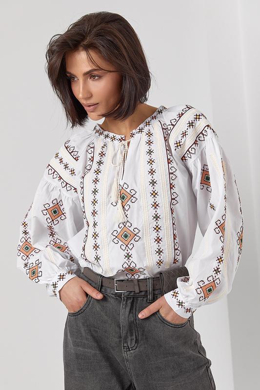 Вышиванка с цветным орнаментом - это стильное сочетание традиционности и современного комфорта. Свободный прямой крой обеспечивает легкость и удобство в носке, а рукава-фонарики, которые застегиваются на пуговицы, добавляют образу нежности и утонченности. Круглая горловина гармонично дополнена разрезом спереди, что придает вышиванке особый шарм. Декоративные завязки в виде кисточек добавляют этнический характер и позволяют регулировать глубину выреза. Рукава, горловина, а также перед изделие украшены цветной вышивкой, которая создает изысканный акцент. Длина переда изделия, см S - 67см; M - 67см; L - 68см; XL - 68см Ширина под проймами рукавов (над грудью), см S - 53см; M - 54см; L - 56см; XL - 57см Длина рукава от горловины, см S - 67см; M - 67см; L - 69см; XL - 69см Длина рукава по внутреннему шву, см S - 49см; M - 49см; L - 51см; XL - 51см Страна Турция Тканина Бавовна Состав ткани 70% хлопок, 30% полиэстер Відправка тільки Нова Пошта