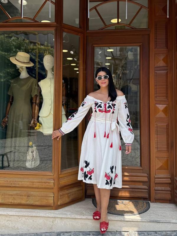 Платье с вышивкой калина. Есть подклад. Пояс в комплекті Модель: 5856 Размеры: S, M, L Уход: ручная стирка до 30° Производство: Турция ________________________________ Полуобхват груди по изделию: S-49 см, M-50 см, L-51 см Длина изделия: S-101 см, М-102 см, L-103 см Длина рукава от горловины: S-58 см, М- 59 см, L-60 см Полуобхват бедер по изделию : 62-65 см