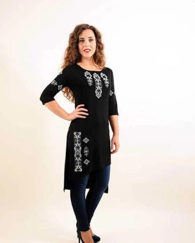 Нова туніка жіноча темно-блакитного кольору. Довга. Нова. Розмір 3 ХЛ. Вишивка машинна хрестиком. Якісна тканина, приємна на дотик. Бавовна 35%, віскоза 55%, еластан 10%. Ідеально пасує з джинсами, лосінами. Напів обʼєм грудей 57 см, довжина по спинці 97 см, спереду косої зріз, 72 см попереду. Довжина рукава 37 см, ширина 17 см.