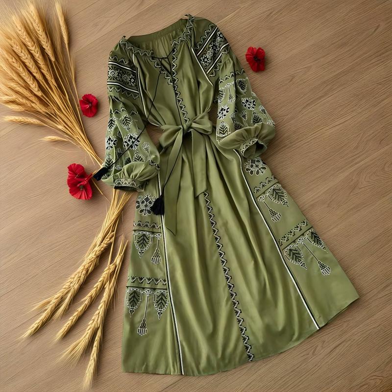 Зелена / хакі / оливкова довга жіноча сукня-вишиванка з біло-чорною вишивкою