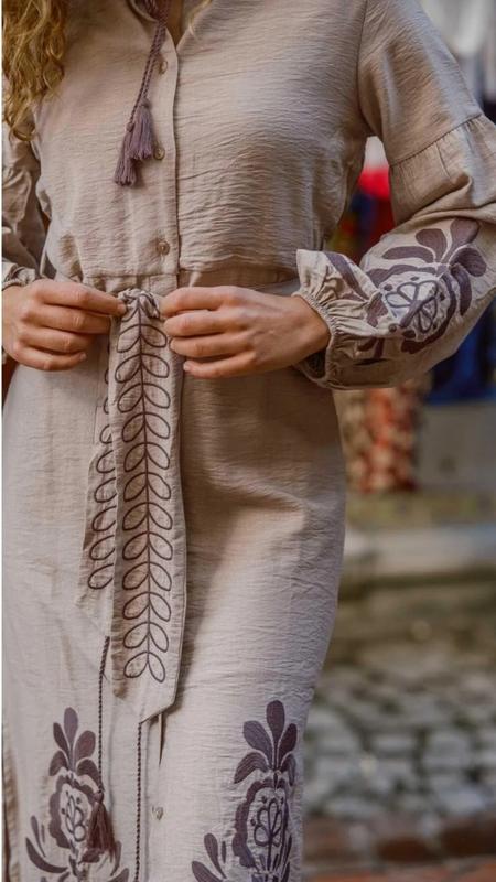 Платье с красивой вышивкой на широких рукавах и подоле дополнено поясом с кисточками