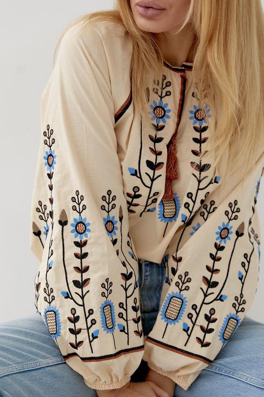 Женская бежевая рубашка вышиванка с васильками, вышитая блуза в украинском стиле