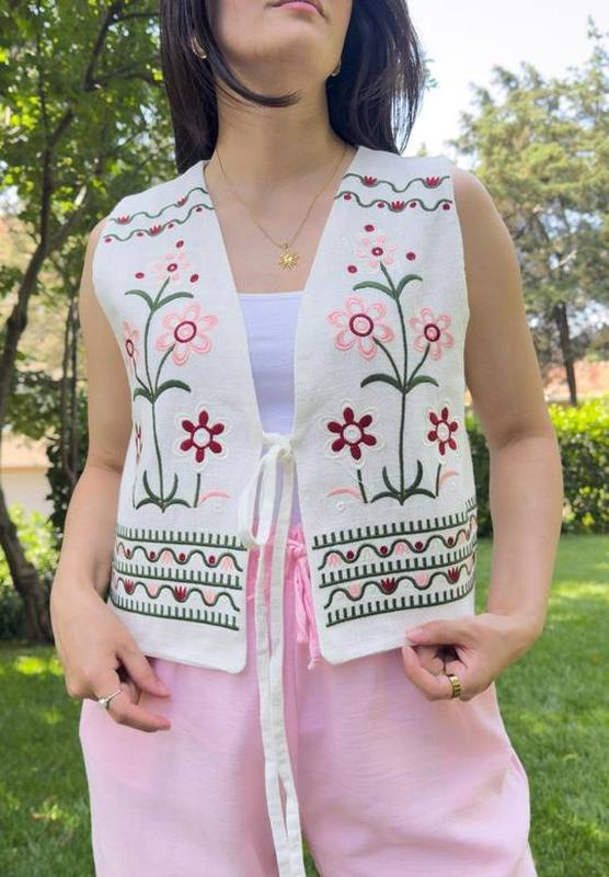 Арт #жилет с вышивкой Размеры: с.м.л Склад тканини на бірці : 80% бавовна , 20% поліестер Турция ОГ: S-48-49 см M-49-50 см L-51-52 см Длина изделия: S-49 см М-50 см L-51 см