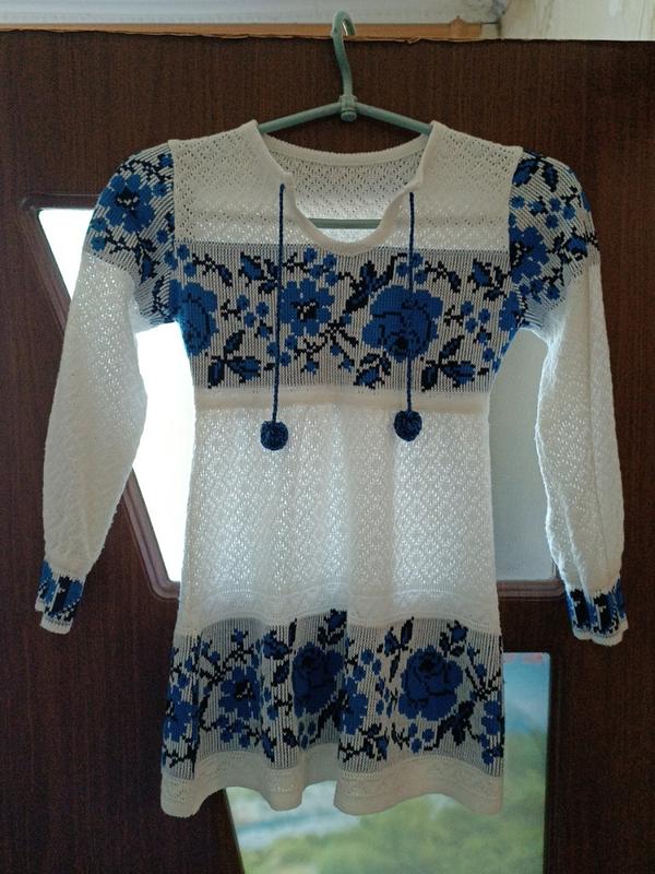 Платье вышиванка вязаное.Длина 60 см. Полуобхват груди 31. Полуобхват талии 27 см.Длина рукава 44см. Подходит на рост 122- 134. В хорошем состоянии.