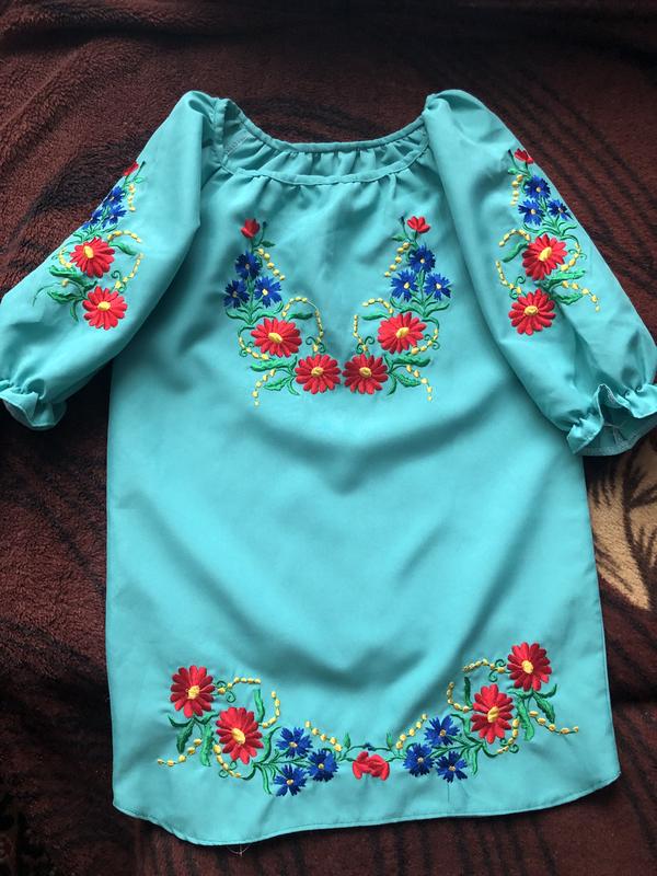 Сукня вишиванка на бірюзовій тканині з вишуканим принтом з тричверті рукавом на дівчинку 6-8років
