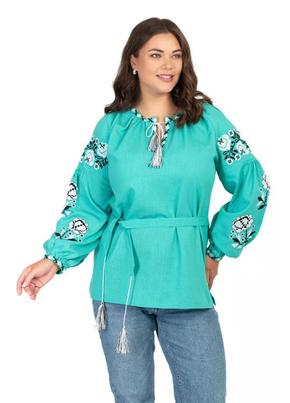 Замеры готового изделия (последнее фото): S/М/46: ширина по груди - 54 см, ширина по бедрам - 54 см, длина рукава - 63 см, длина изделия - 67 см. M/L/48: ширина по груди - 56 см, ширина по бедрам - 56 см, длина рукава - 64 см, длина изделия - 68 см. L/XL/50: ширина по груди - 58 см, ширина по бедрам - 58 см, длина рукава - 66 см, длина изделия - 69 см. XL/XXL/52: ширина по груди – 60 см, ширина по бедрам – 60 см, длина рукава – 67 см, длина изделия – 70 см. 2XL/3XL/54: ширина по груди - 62 см, ширина по бедрам - 62 см, длина рукава - 68 см, длина изделия - 71 см. 3XL/4XL/56: ширина по груди – 64 см, ширина по бедрам – 64 см, длина рукава – 72 см, длина изделия – 72 см. Материал не тянется, поэтому советуем иметь запас по груди 8-10 см от настроек тела к замерам готового изделия. Эта модель блузы свободного покроя с длинными рукавами. Ее главная изюминка - вышивка с цветочным орнаментом на рукавах, что добавляет утонченности. По горловине есть завязки с кисточками, а пояс элегантно подчеркивает талию. Льняная ткань (80% лен, 20% полиэстер) легкая и приятная на ощупь - идеальна для стильного и комфортного образа.