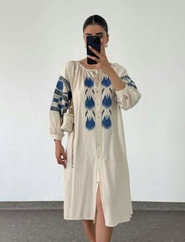 кремовое платье с утонченным голубым вышивкой на рукавах и передней части создано для настоящих ценителей украинской этники и элегантности. Благодаря своей универсальности, она отлично подойдет не только для повседневных выходов, но и станет идеальным выбором для праздничных и торжественных событий - крестин, весель или семейных празднований. Длина платья - 111 см, доступна в разных размерах: - S: обхват грудей 118 см, - M: обхват грудей 123 см, - L: обхват грудей 126 см. Эта модель с нежной вышивкой и широкими рукавами добавляет легкости и женственности каждому образу