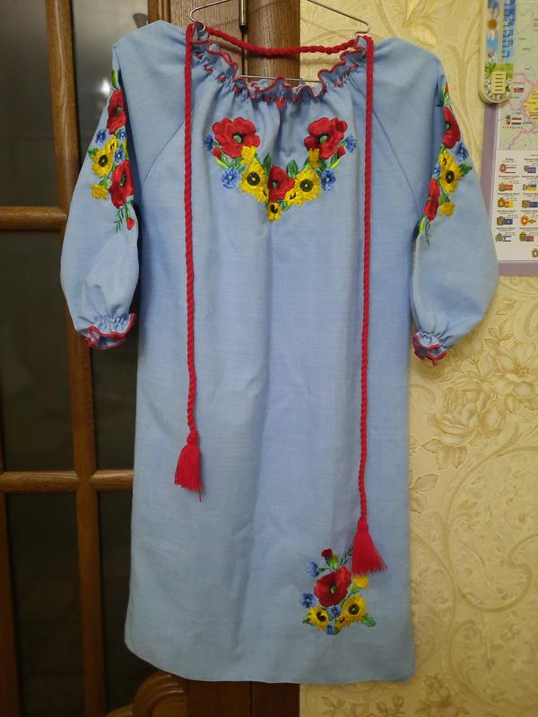 Продам новое платье вышиванку, голубого цвета. Вишивка машинна,подсолнухі,та маки.Рукав 3/4. Длина рукав от горловины 45см, п о г 48, длина 80см.
