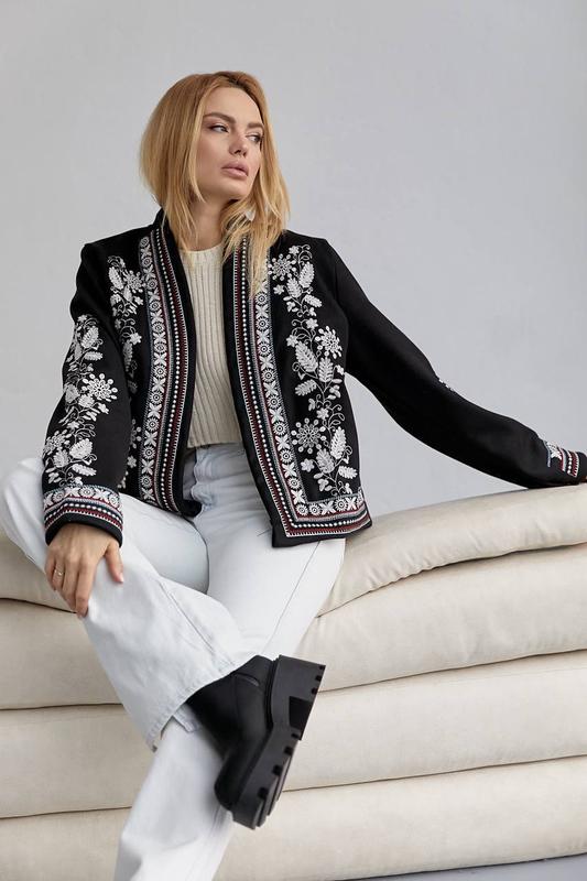 Женский #пиджак с вышивкой Размеры : С.М.Л Состав ткани : 80% коттон, 20% полиэстер Ткань напоминает кашемира Замеры: Полуобхват груди по изделию: S-55 см, M-56 см, L-57 см Длина изделия: S-56 см, М-57 см, L-58 см Длина рукава от плечевого шва: S-57 см, М- 57 см, L-58 см мод.вишту11