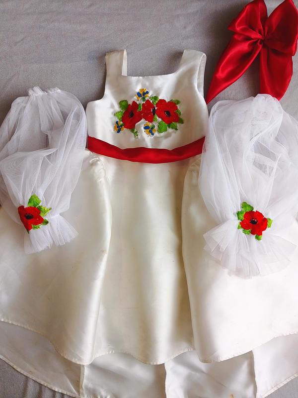 В комплект входить: 1).Вышитое платье светло молочного цвета (вблизительно к белому цвету). 2).Рукава фонарики. 3). Бантик на волосы. 4) Пояс лента. Платье ориентировано на девочку 5-7 лет. Длина платья -72 см. ПОГ -27,5 см. ПОТ - 27,5 см. Длина рукава- 37 см. Есть фото на теле, отправляю по запросу.