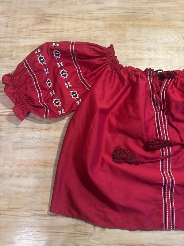 Надзвичайно гарного кольору вишиванка з рукавами ліхтариками та машинною вишивкою. Склад -100% коттон. Можна носити з відкритими плачами, або підняти рукави на верх. Хоч розмір вказаний М, але я брала на XS і все добре сіло. Нова, з етикеткою. Лінія Zara для ЄС, ціну в ретейлі видно на етикетці