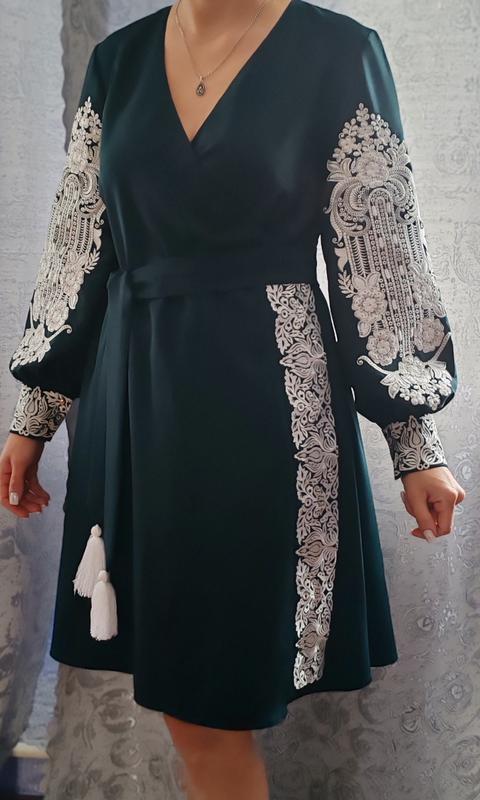 Вышитое платье на запах,темно-зеленого цвета с белой вышивкой (машина вышивка), пояс в комплекте с белыми кисточками, ткань костюмная "креп". Ог-48,От-46(есть возможность откорректировать на больший объем талии), длина платья-101,длина рукава-63,ширина плеч-40.