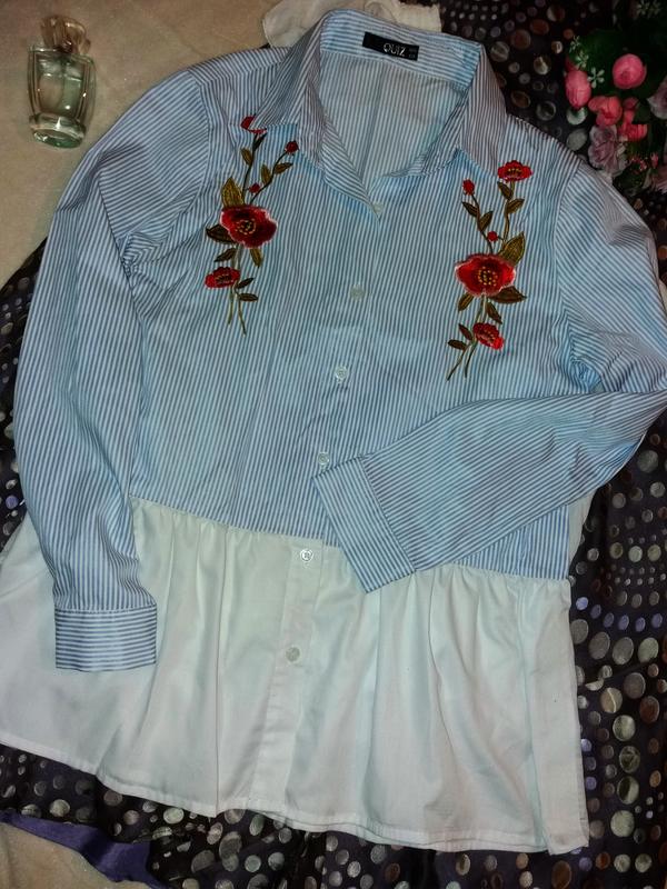 Красивенная вышитая рубашка в голубую полосочку,с баской,44-48разм.,quiz