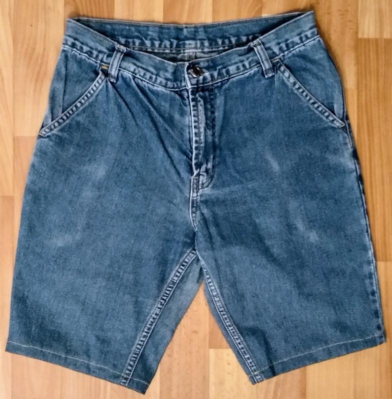 Шорты синего цвета в отличном состоянии. Материал 100% хлопок. С элементами легкой потертости. Общая длина 45 см, полуобхват талии 34 см, полуобхват бедер 45 см, длина по внутреннему шву 22 см, полуобхват ноги вверху штанины 27 см, ширина внизу штанины 20 см, посадка спереди 25 см, посадка сзади 35 см.