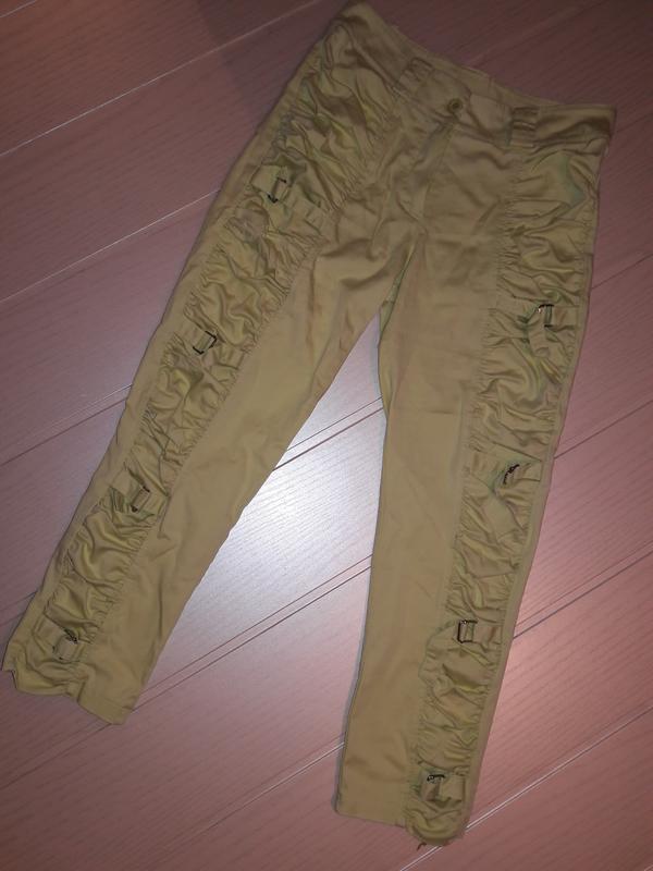 Капри салатового цвета, драпировка, объем регулируется ремешками, посадка высокая. Дефектов нет.