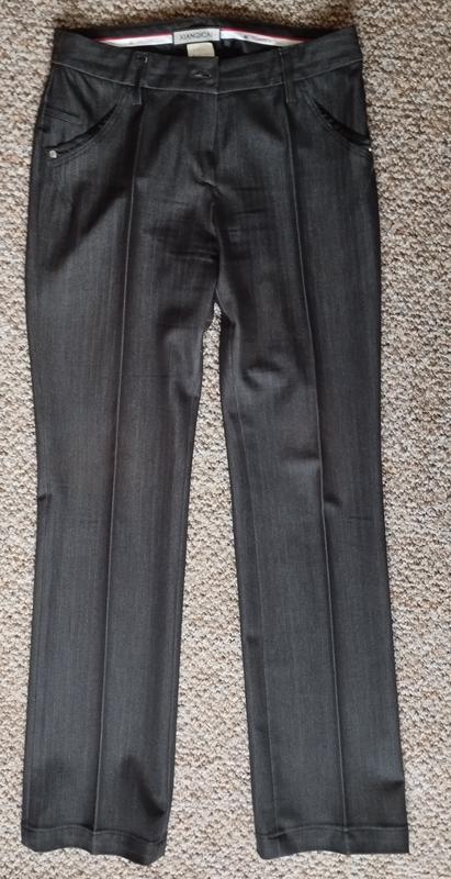Брюки женские прямого делового покроя. Цвет черный с отблеском , размер на наш 42-44. Замеры: п/о талии 36 см , п/о бедер 45 см., длинна 104 см, длинна по внутреннему шву 80 см. Посадка средняя.