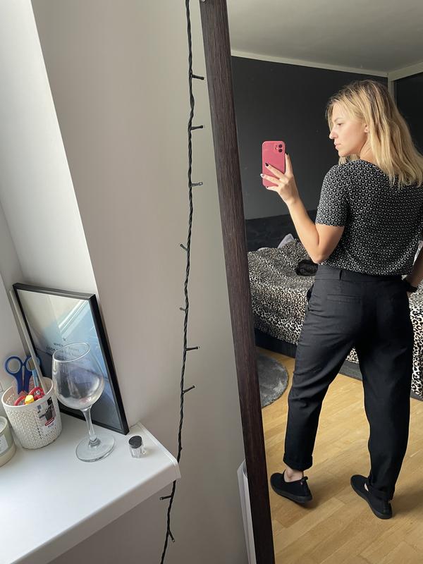 Стильные черные брюки H&M размера 34, хотя больше подходит на 36 размер Длина брючины 93 см Обхват живота 80 см Обхват бедер 90-93 см Брюки на девушке размера С и ростом 160 см ( на фото брюки немного подвернула) За дополнительной информацией пишите)