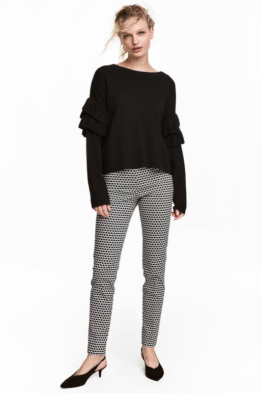 Укороченные слаксы из эластичной ткани. Талия стандартной высоты с потайной молнией с одной стороны. Узкие брючины с разрезами снизу. Ложный карман сзади. Размер 34(укр 40) На ОТ-64см, ОБ-88см. Рост 160см. Повреждена внутренняя бирка.