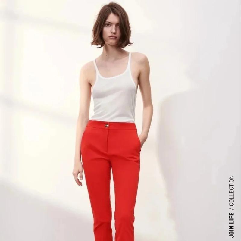 Яскраво червоні брюки Zara Нові з оф.сайту Ззаду на поясі чорна вставка На штанинах знизу манжети 💛Розмір S Заміри -- талія 34см, бедра 44см, довжина 93см Тканина тягнеться