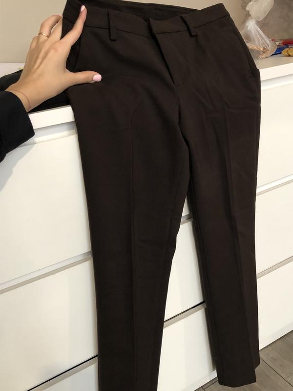 Коричневі класичні брюки, трохи укорочені, в хорошому стані, низька посадка, є кишеньки, фото на тілі немає.