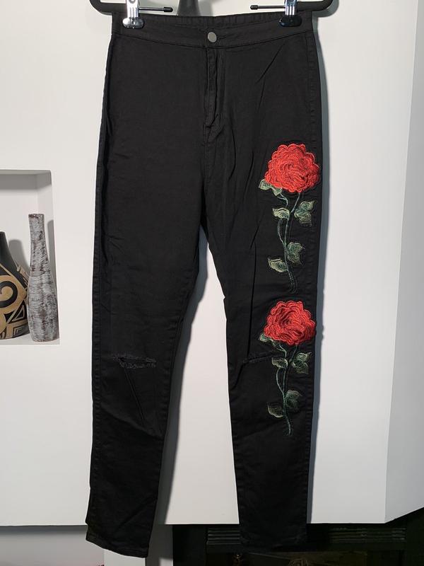 Состояние идеальное Чёрного цвета С вышивкой На коленях рванки Высокая посадка Ткань хорошо тянется Средней плотности Бирка с размером срезана ориентируйтесь по замерам Замеры Пот 33+ Поб 44 Посадка 32/38 Длина 103 Низ по 14