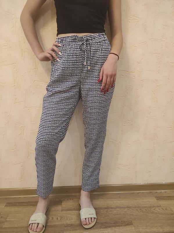 Стильные укороченные брюки без застежек, из текстурной ткани, с резинкой и кулиской на талии. Боковые карманы и ложные прорезные задние карманы. Слегка зауженная книзу модель с короткими разрезами снизу. Идеальная посадка по фигуре Абсолютно новые, отсутствует картонная этикетка. ПОТ - 34 см, максимально - 41см ПОБ - 48-51 см Высота посадки - 26,5 см Длина по внешнему шву - 93 см, по внутреннему - 66 см