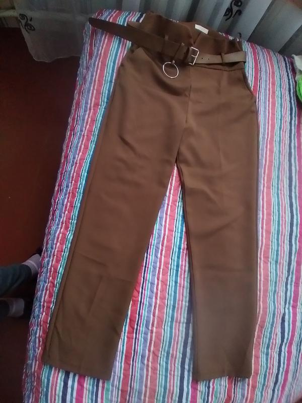 Штани костюмні,коричневого кольору.Ідуть висока посадка яка заходить на живіт,з пояском.Розмір пише 44 але ідуть на повний 46.Стан новий ніразу не одягала.