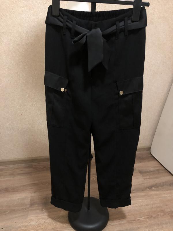 Класні чорні штани брюки. По бокам кармани, зверху на завязках. Пояс має ззаду резинку. Матеріал не тягнеться, укорочені . Розмір 44-46. Заміри надам по запиту. Не просвічується. При покупці однієї речі можна вибрати подарунок, двох і більше знижки