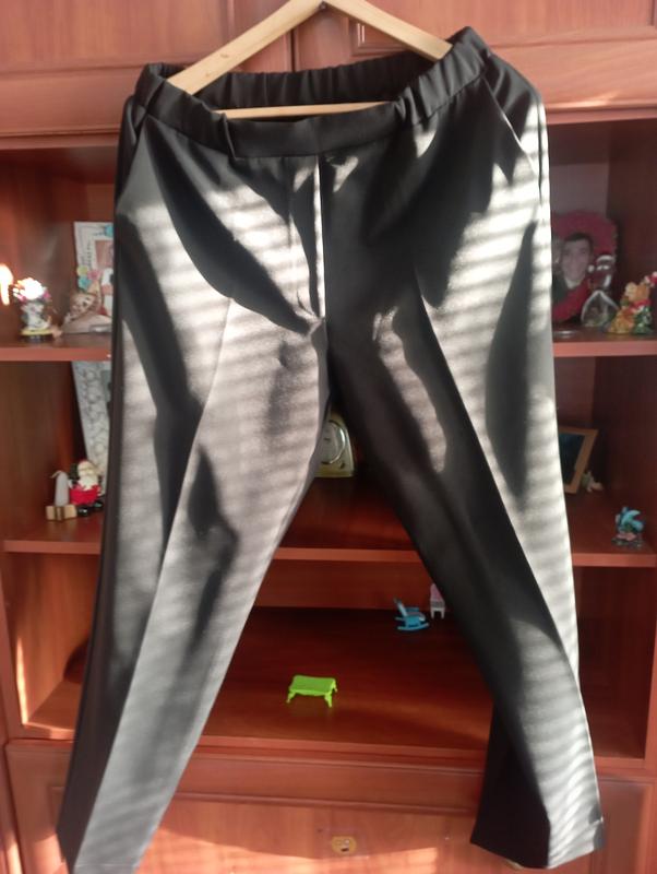 Черные брюки рр 44,е пиджак. Длина 98, поширина пояса 39 есть резинка тянутся до 48, победер 60.Зои стрелками состояние новый, промежутк ножек чуть светлее, но зато засветил телефон🤔