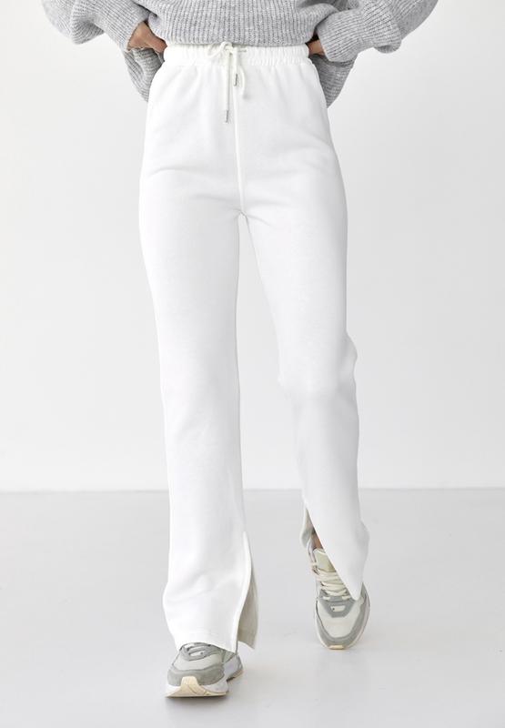 Такі стильні жіночі штани прямого крою, допоможуть тобі створити ідеальний силует, підкресливши лінію талії своєю високою посадкою. Модель не обмежує рухів завдяки трикотажній тканині з начосом. Краї прямого низу доповнені короткими розрізами на внутрішніх швах, а широкий втачний пояс із резинкою йде із зав'язками.