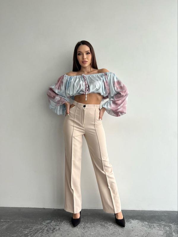 Штани Модель 495ряб Тканина: костюмна Размеры: 42-44, 44-46 Цвета: черный, беж, кемл Трендовые брюки с высокой талией и эффектными вырезами на боках, придающими пикантности образу❤️ Фото Реал